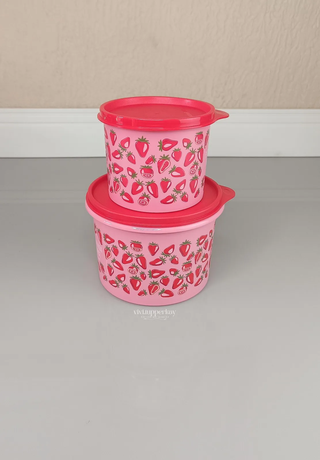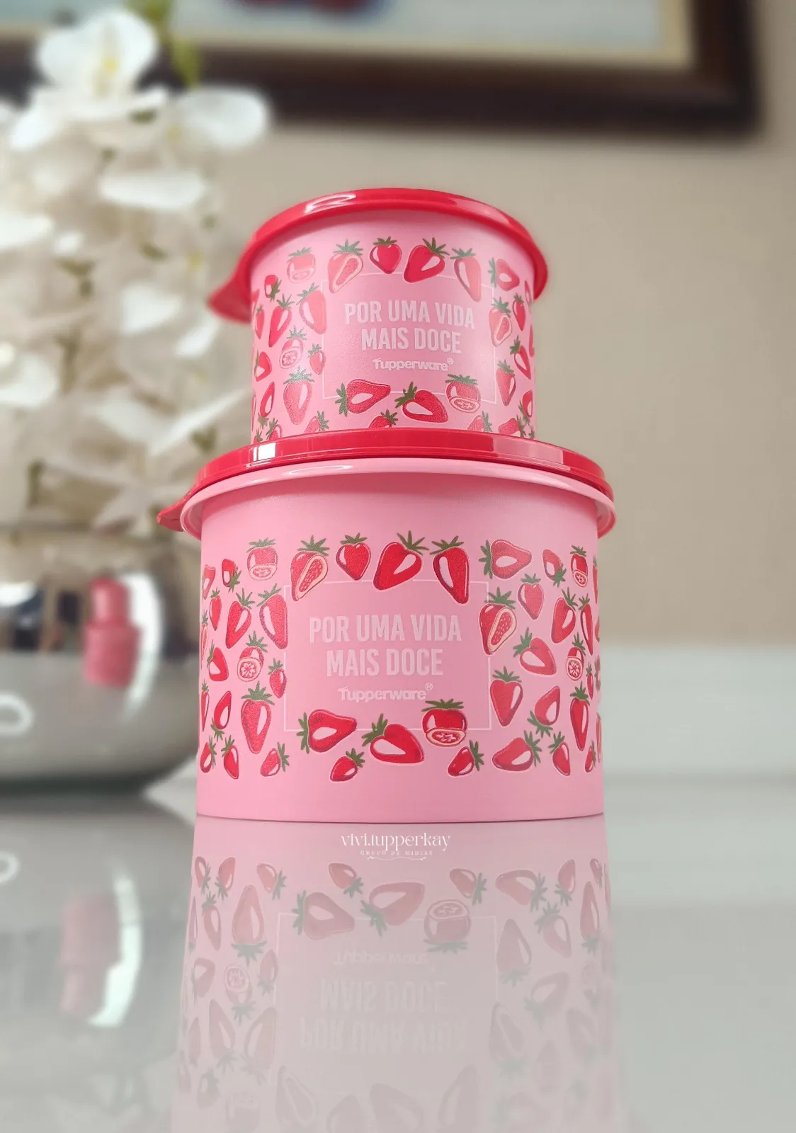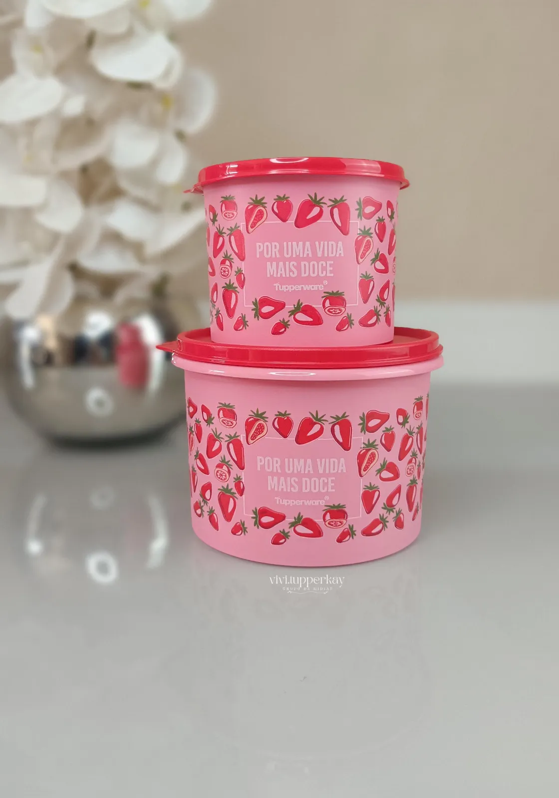 Kit Tupperware Morango do Amor vai deixar seus momentos ainda mais especiais! Ele vem com a Caixa 1,1 litro e a Redondinha 500ml, perfeitas para guardar lanches, frutas ou aquele docinho que você ama ter sempre à mão. Além de práticas, trazem a qualidade que só a Tupperware oferece para o seu dia a dia.